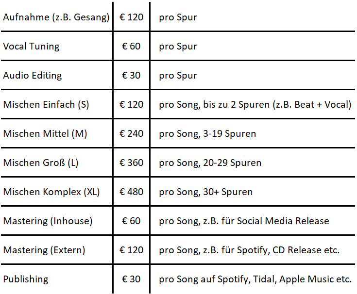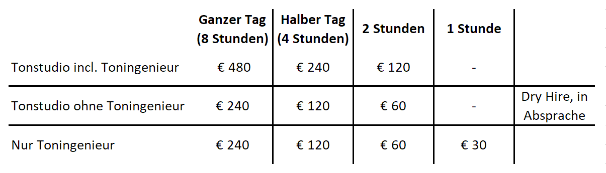 Leistungen und PreiseWir versuchen aus jedem Projekt das bestmögliche Ergebnis herauszuholen ohne dabei den Spaß am Musik machen aus den Augen zu verlieren. Wir wollen dabei mit überschaubaren Kosten jedem Musiker eine Aufnahme-Session in unserem Studio ermöglichen. Zeitbasierte ProjekteFür komplexere Projekte sollte das komplette Studio gebucht werden. Dies ermöglicht eine entspannte kreative Atmosphäre. Enthalten sind alle Kosten - Räume, das Equipment, vorhandene Instrumente, der Toningenieur und alle anfallenden Arbeiten. Es wird zeitbasiert abgerechnet. Gast-Toningenieure sind herzlich willkommen. |